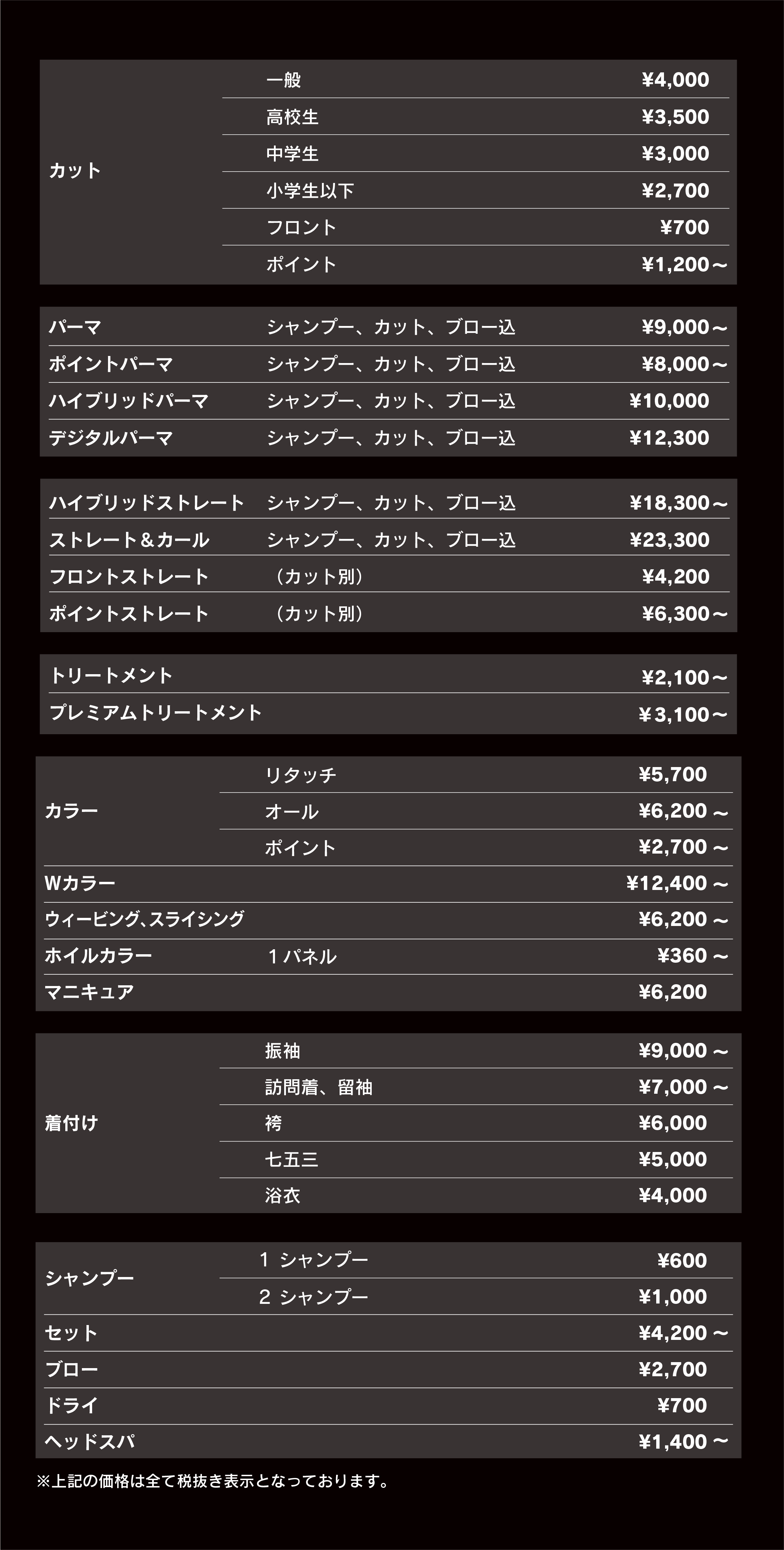上記以外にも、ポイントカット・ポイントパーマなど、お客様のご希望に添った細かなメニューをご用意しておりますので、お気軽にお問い合わせください。