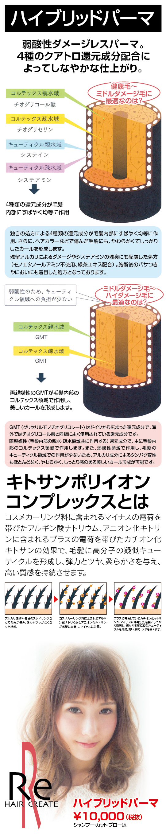 「4種のクアトロ還元成分システム」でダメージレスヘアを追求まったく新しい『NEW!ハイブリッドパーマ』をお試しください。